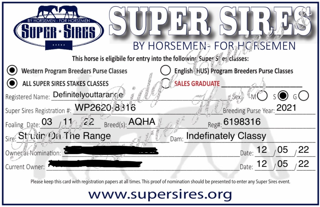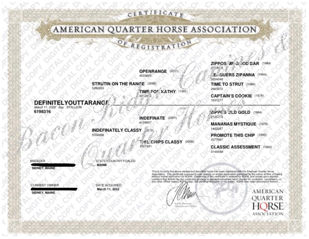 2022 AQHA / NSBA / Super Sires-registered Bay Stud Colt by Strutin On The Range x daughter of Indefinate (Zippos Old Gold)/Zips Chocolate Chip/Investment Asset.